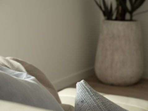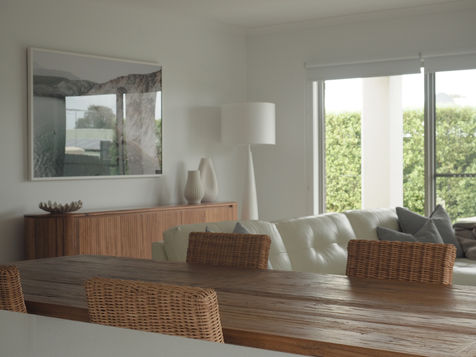Inspired by the natural austerity of the Greek islands - this open coastal living space was shaped around the softness of a chalky palette, anchored in layered sun washed whites, blues. Warm timber accents and sculptural forms introduce texture and balance.